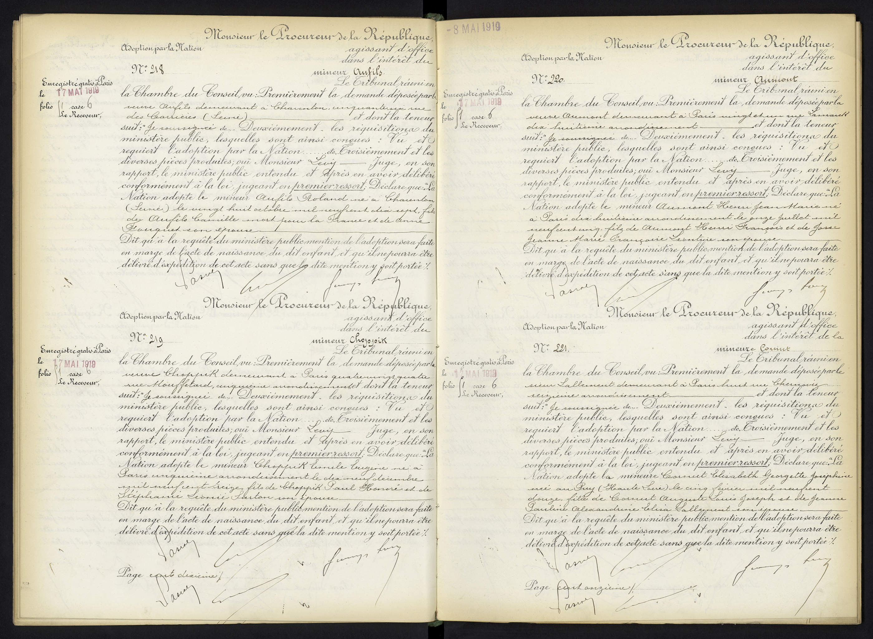 Jugement du tribunal de la Seine du 8 mai 1919 d‘adoption par la Nation d’Emile Choppik