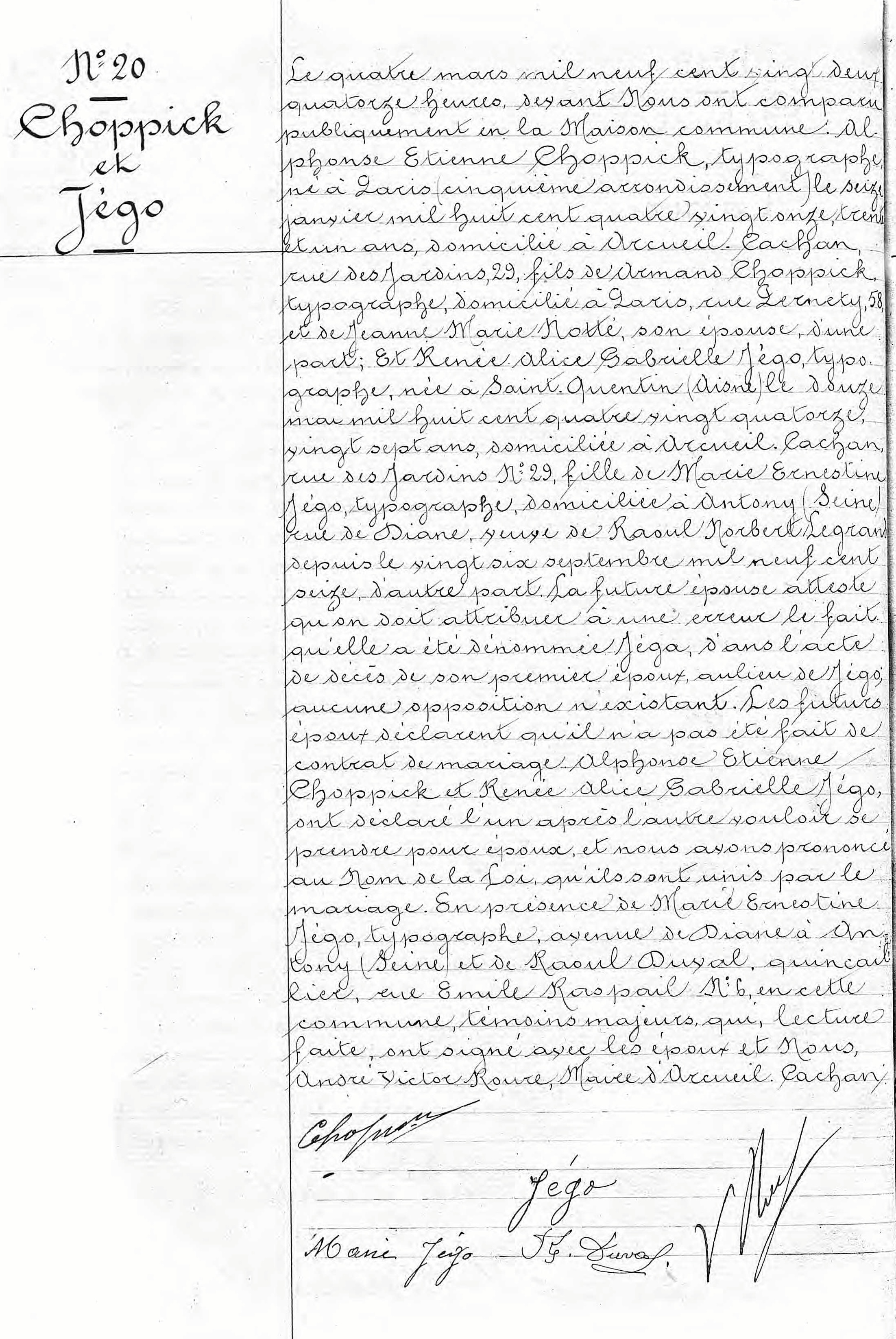 Acte de mariage Alphonse Chopick et Renée Jego - Arcueil 4 mars 1922