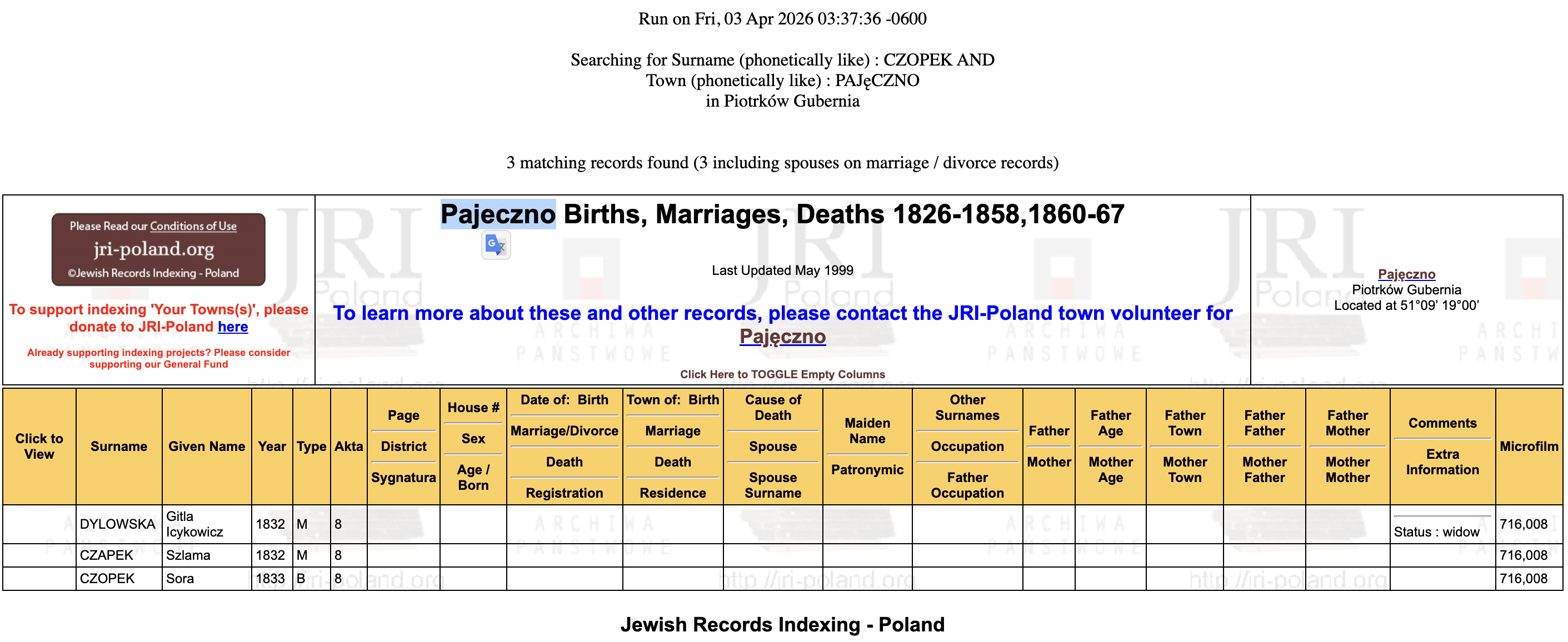 Indexed extract of Pajęczno Births, Marriages, Deaths 1826-1867