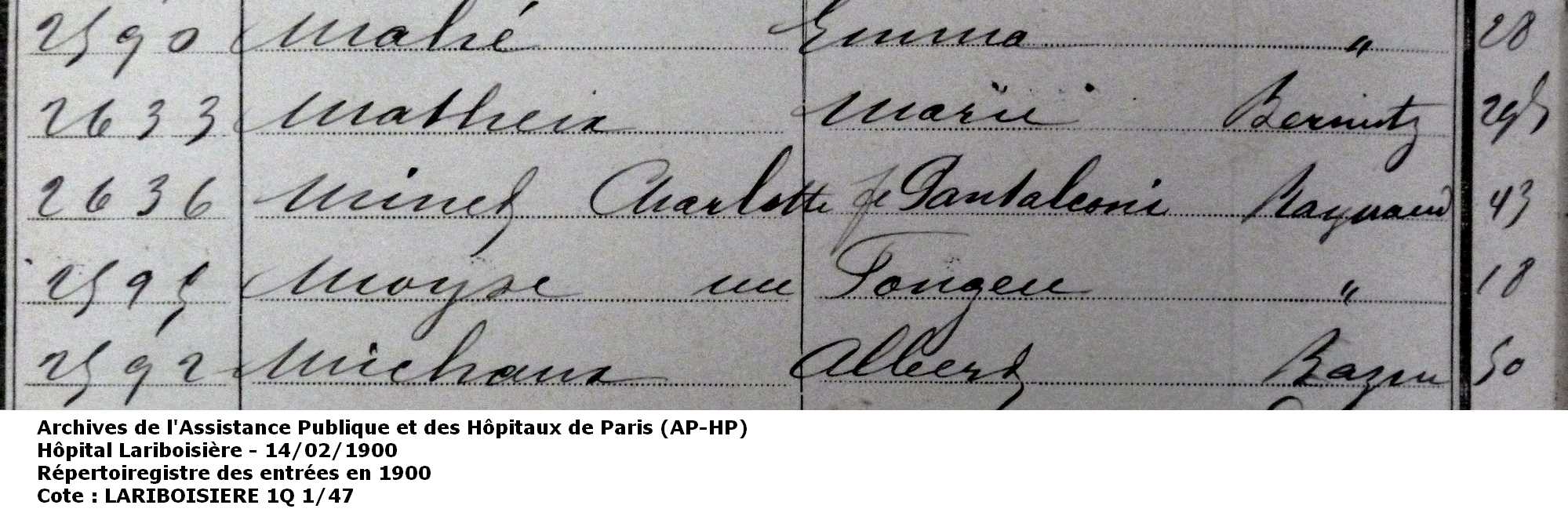 Régistre des entrées de l'hôpital Lariboisière - 14 février 1900 - Sophie Charlotte Miné
