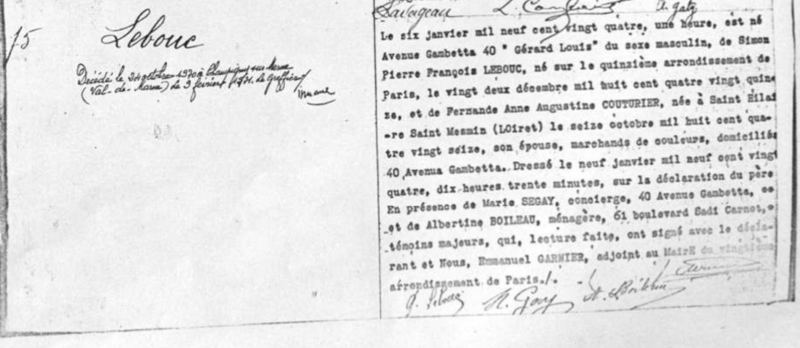 Acte de naissance de Gérard Lebouc - 9 janvier 1924