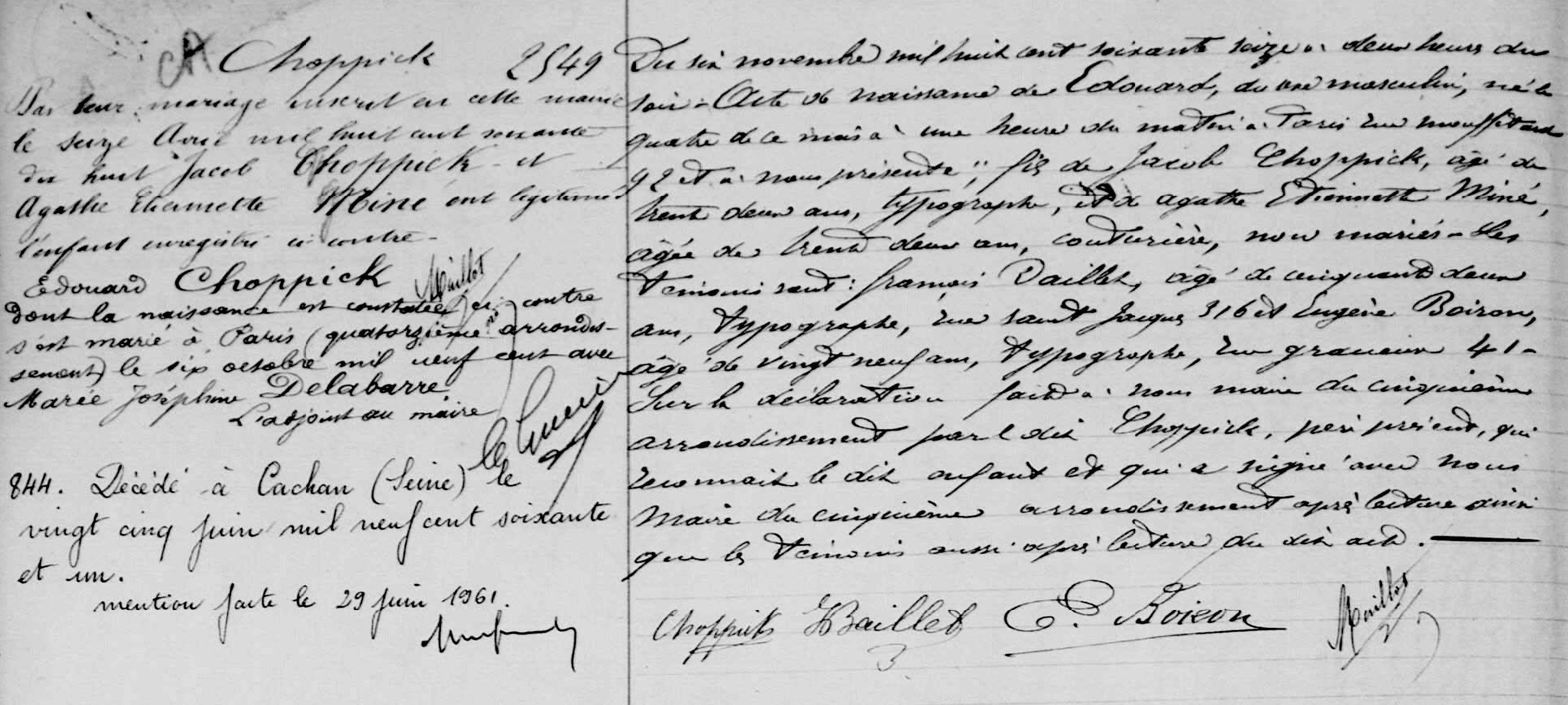 Une autre part est parisienne (noms de famille Chopic, Choppick, Choppi, Choppy) avec une origine pour l'instant mal déterminée, soit alsacienne, soit d'Europe Centrale et Orientale (très probablement des migrants juifs "sans papiers" venant du territoire des actuelles Pologne, Ukraine ou Slovaquie).