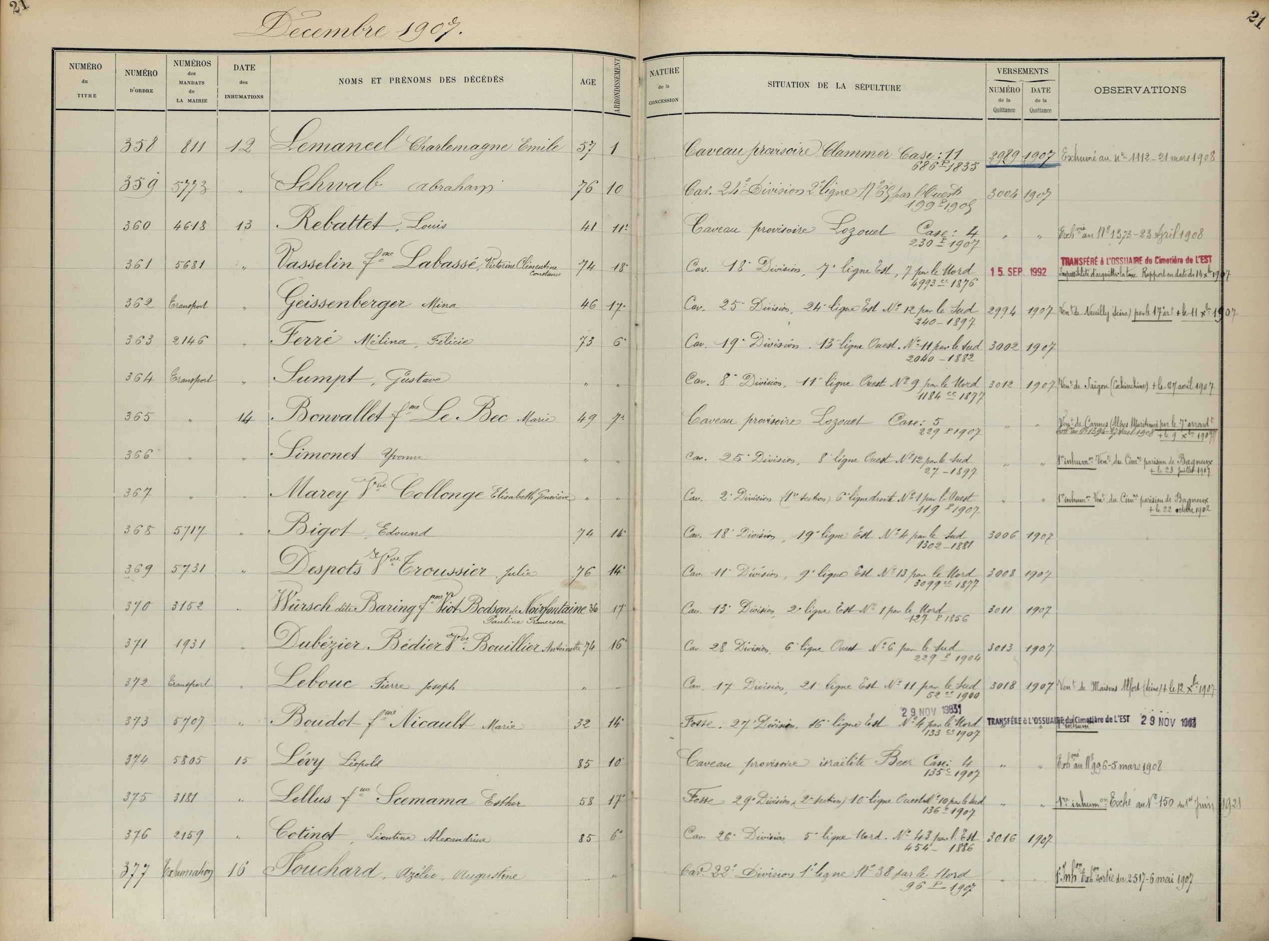 Décès à "minuit et trente minutes" Témoins : Victor Sacotte, employé, 37 ans et Joseph Sellier, 38 ans, employé (il est mentionné "non parents") Inhumé au cimetière Montparnasse |