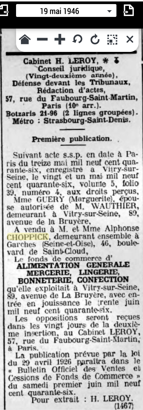 Le 19 mai 1946, Alphonse Choppick et sa femme achètent un commerce à Vitry sur Seine.
