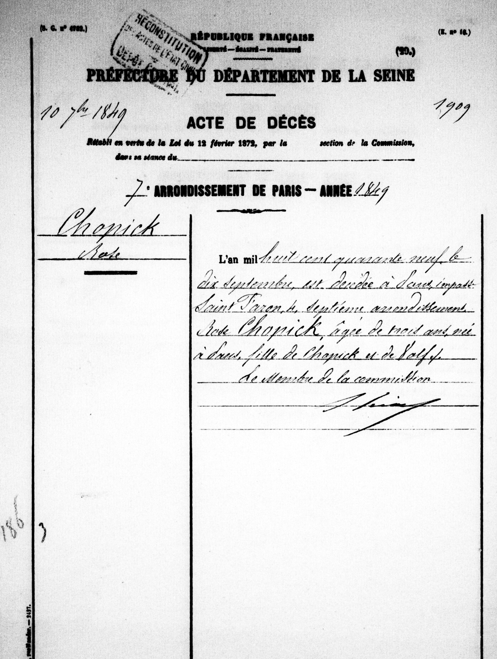 C'est pourquoi l'on retrouve, en 1874, dans la reconstitution de l'acte de naissance d'Alphonse Choppick une attestation de date de naissance établie par le Grand Rabbin de Paris Zadoc Kahn le 14 mars 1872.