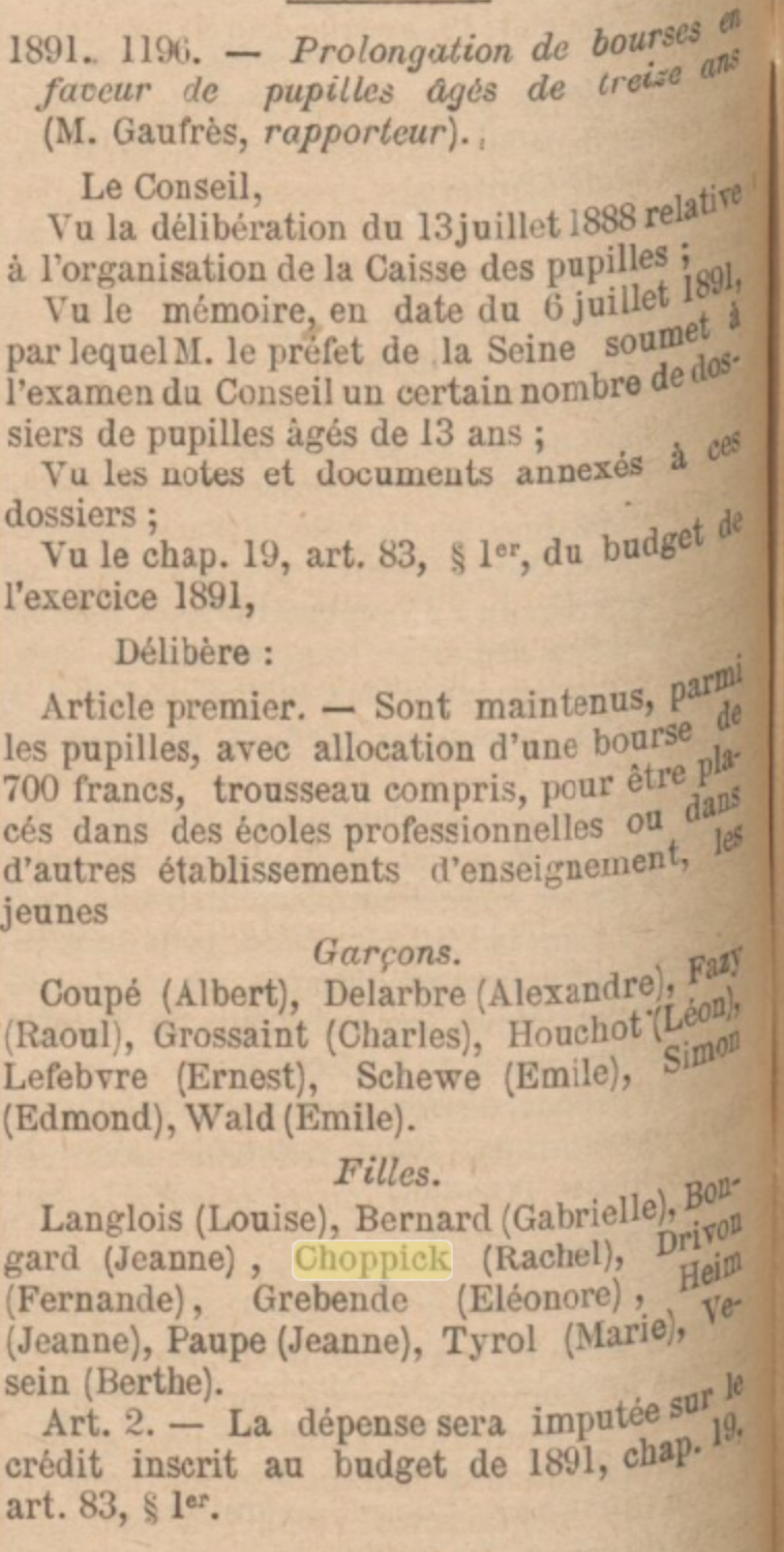 "Sont maintenus, parmi les pupilles, avec allocation d'une bourse de 700 francs, trousseau compris, pour être placés dans des écoles professionnelles ou dans d'autres établissements d'enseignement, les jeunes" [suit une liste assez courte dont "Choppick (Rachel)"]