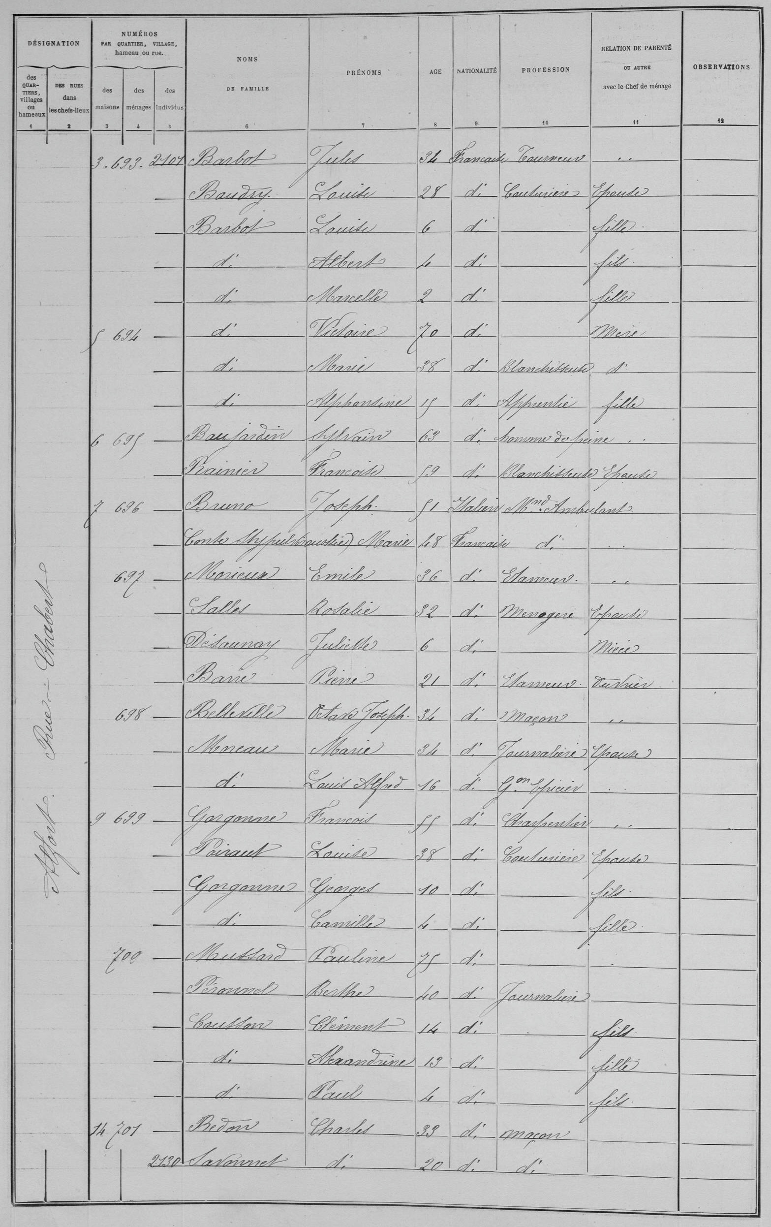Habitent au 6 rue Chabert Maisons Alfort au début des années 1890 : Sylvain Beaujardin (terrassier, manœuvrier, homme de peine), Françoise Beaujardin / Françoise Arbenne (laveuse, blanchisseuse) et Constance Beaujardin (laveuse)