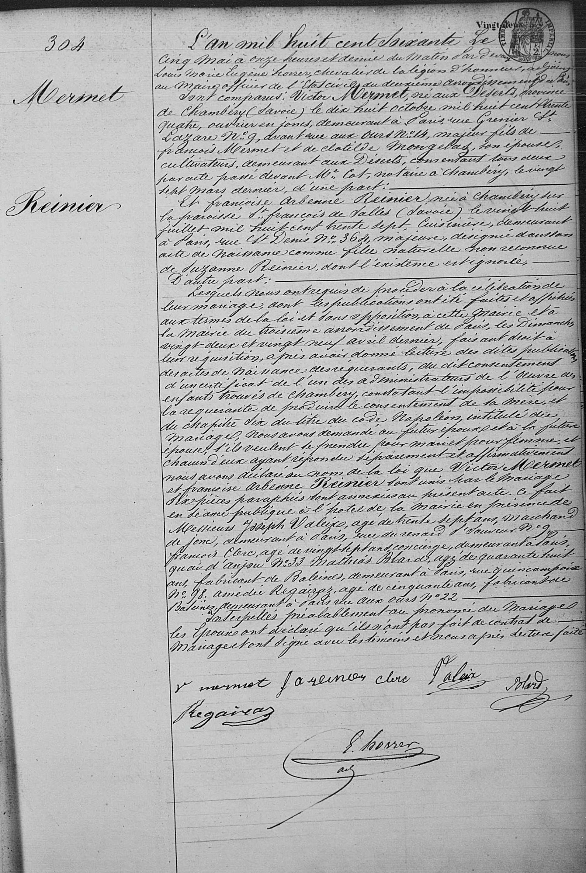 Mariage à onze heures du matin. Victor Mermet et Francoise Arbenne Reinier se sont mariés à Paris IIe le 5 mai 1860, à cette date l'annexion de la savoie par la france est décidée mais pas encore effective.