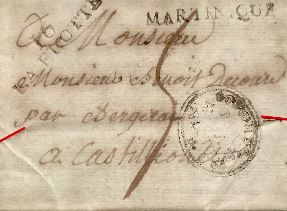 Marque linéaire MARTINIQUE, marque linéaire 16 LA FLOTTE et marque ovale COLONIES PAR LA FLOTTE.