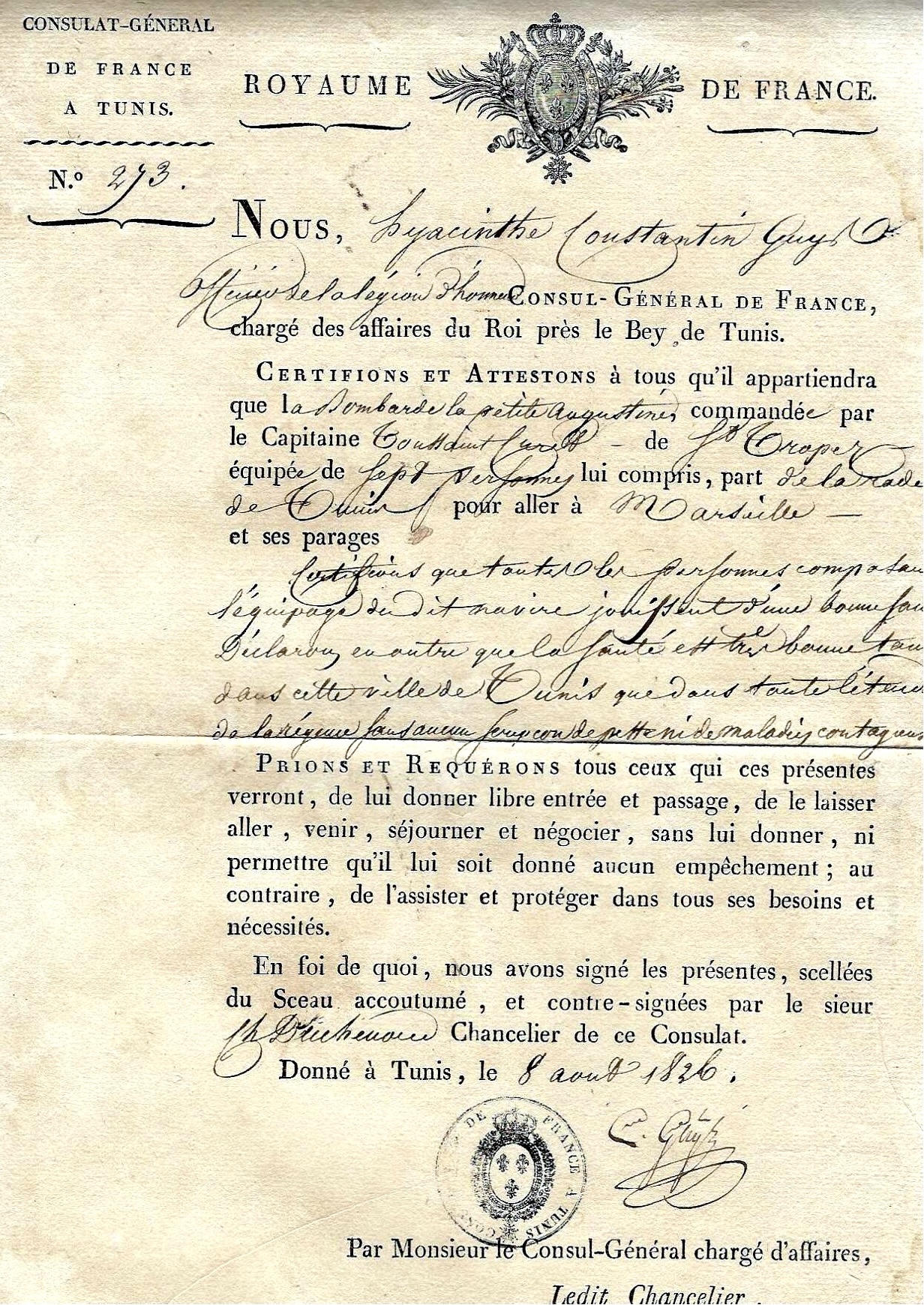 Cette patente sanitaire porte la signature de Hyacinthe Constantin Guys, consul général de France à Tunis de 1824 à 1827.