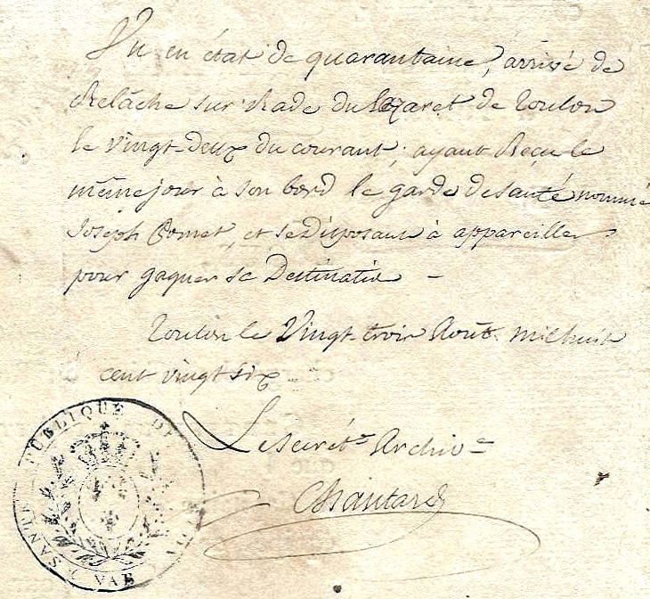 Arrivés sur la rive nord de la Méditerranée, le bateau, sa cargaison et son courrier sont placés en quarantaine au lazaret de Toulon.