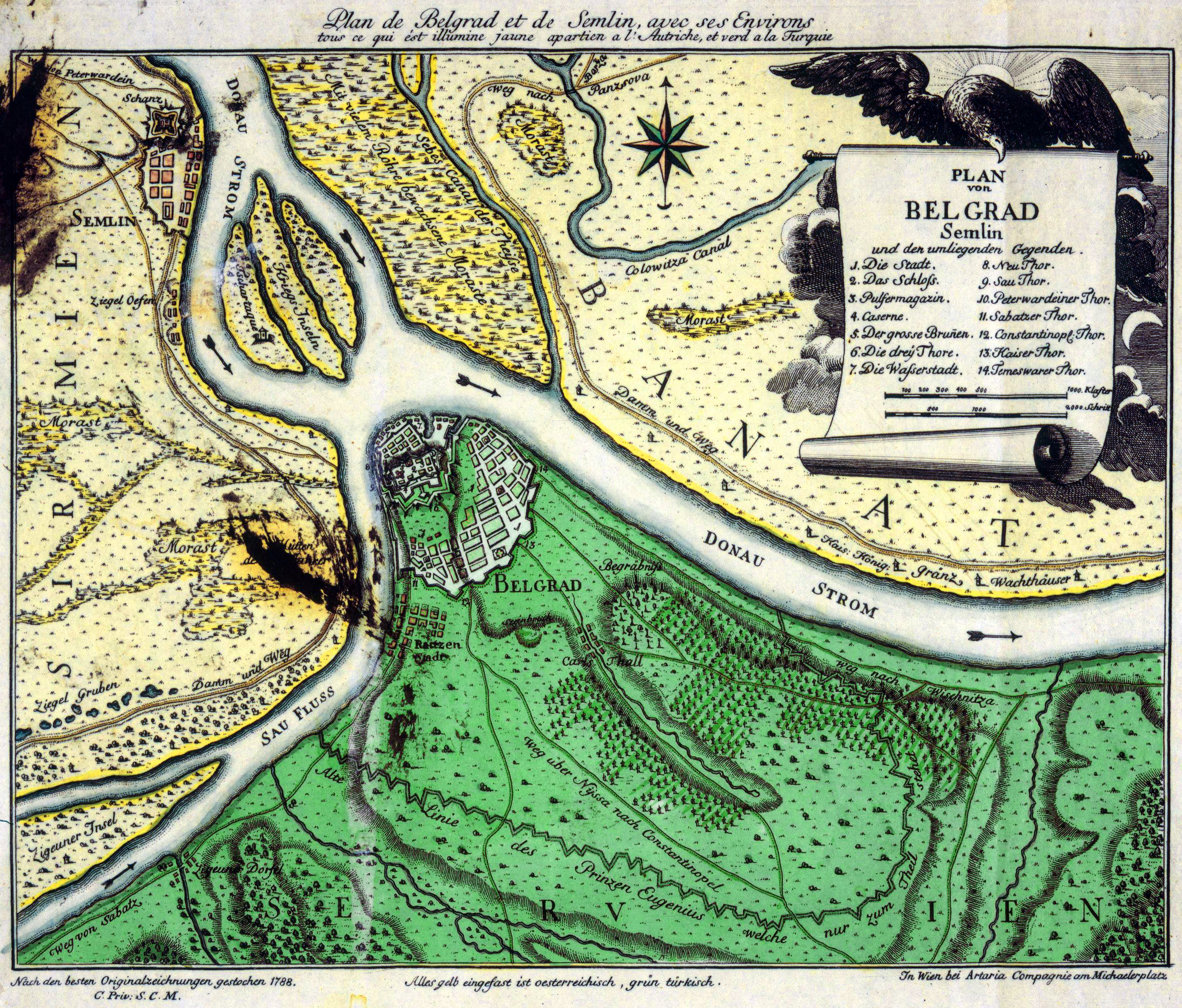 Les deux cours d’eau frontière, entre Empire d’Autriche et Empire Ottoman, sont respectivement indiqués, pour le Danube « Donau Strom » et pour la Save - Save « Sau Fluss ».