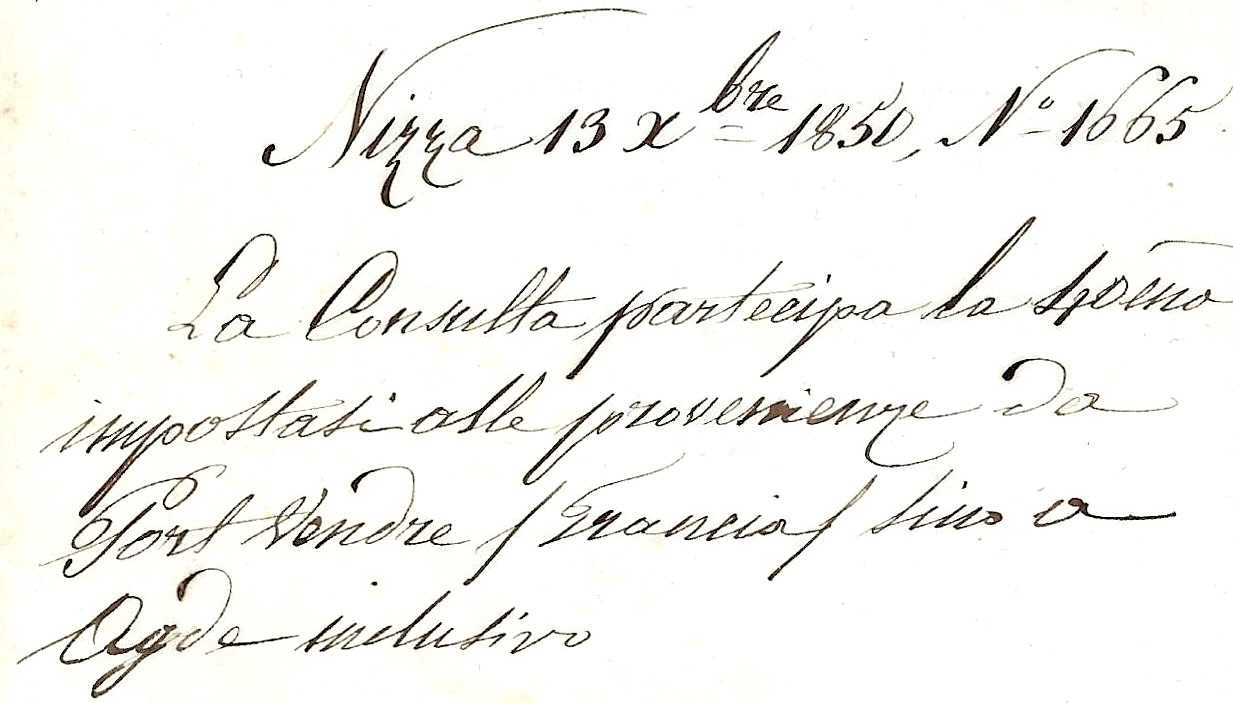 ![Extrait du texte en italien : « Nizza 13 Xbre 1850, N°1665 »<br />« La Consulta partecipa la sporca impostasi alle provenienze da Port Vendre (Francia) fino a Agde inclusivo ».<br />Traduction en français : Nice, 13 décembre 1850, N°1665, la commission de santé notifie que la [patente] brute est imposée aux provenances de Port-Vendres (France) jusqu'à Agde inclus.](/lettres-purifiees/lettres/1850-nice-villefranche/fig1.jpg)