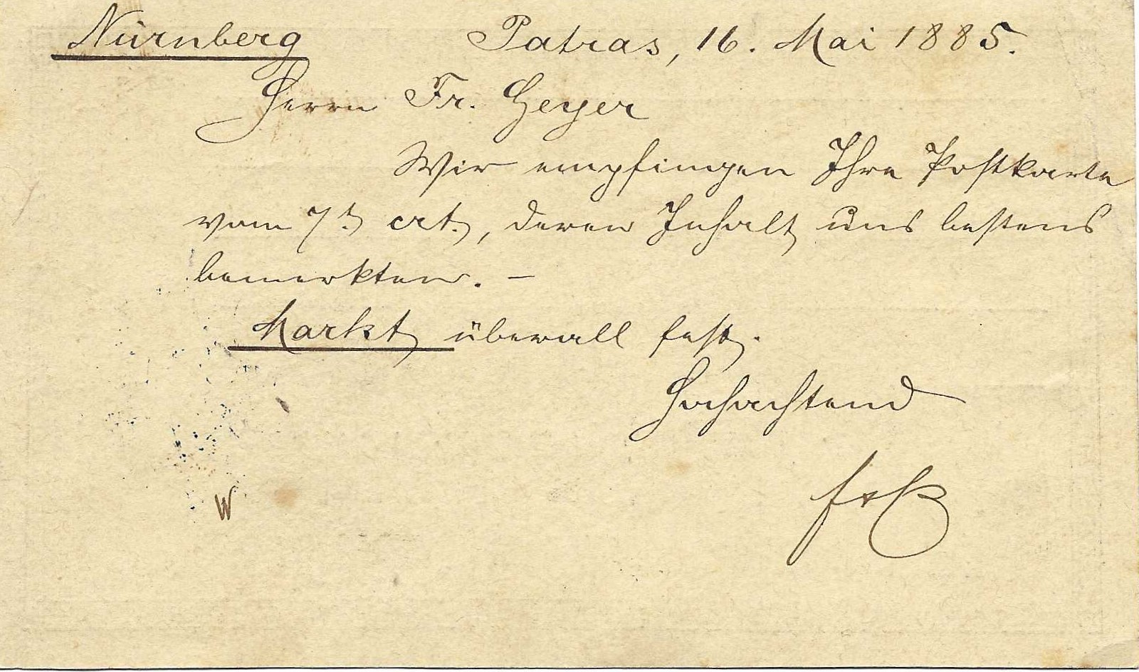 Cachet d’arrivée NÜRNBERG du 23 mai 1885 (date grégorienne).